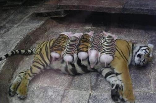 A mother tiger lost her cubs due to premature labor. She was later diagnosed with depression. Since tigers are endangered, every effort was made to secure her health. Zoologists wrapped piglets up in tiger-print cloth, and presented them to the mother tiger. She now loves these piglets and treats them like her own.