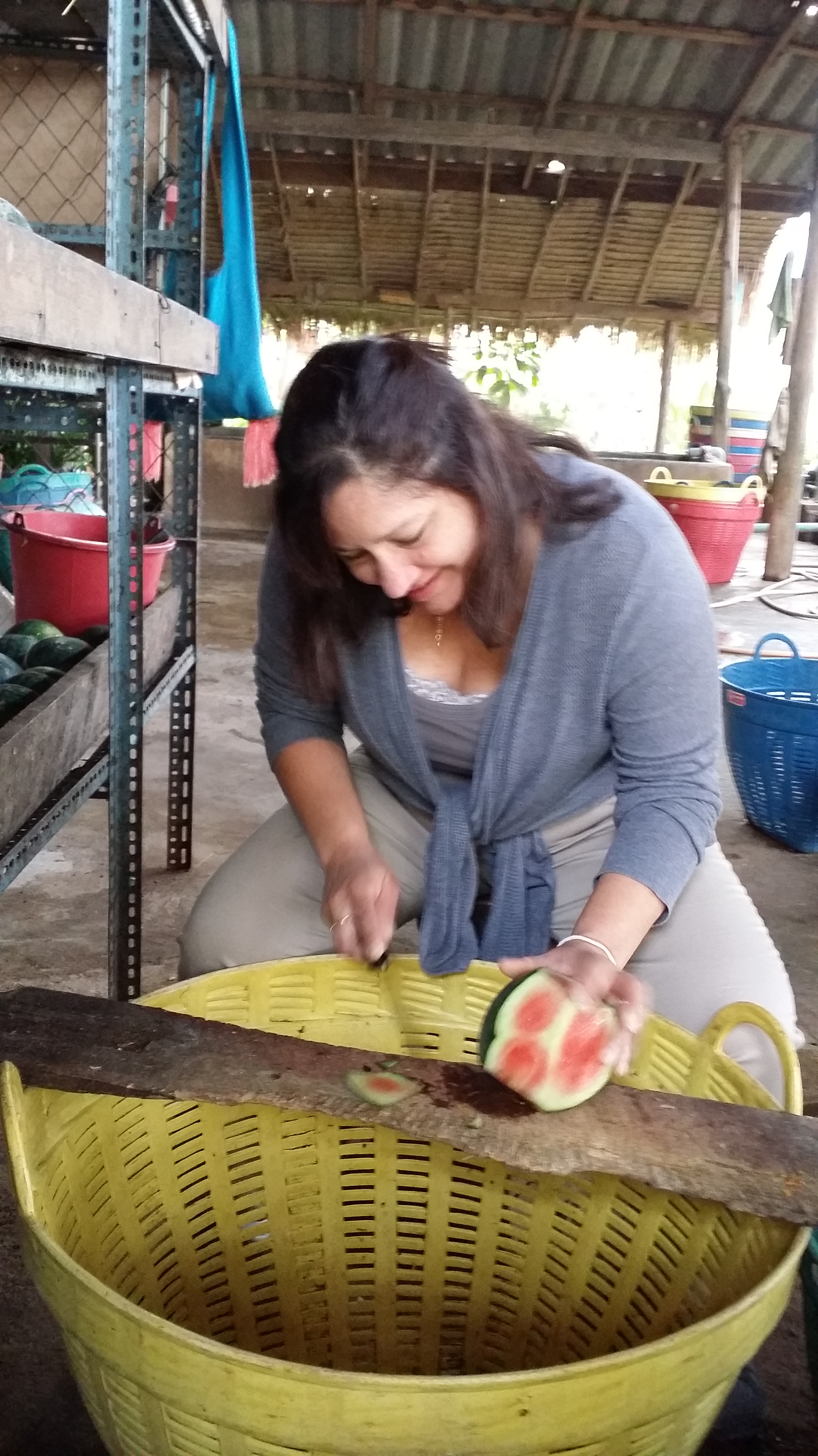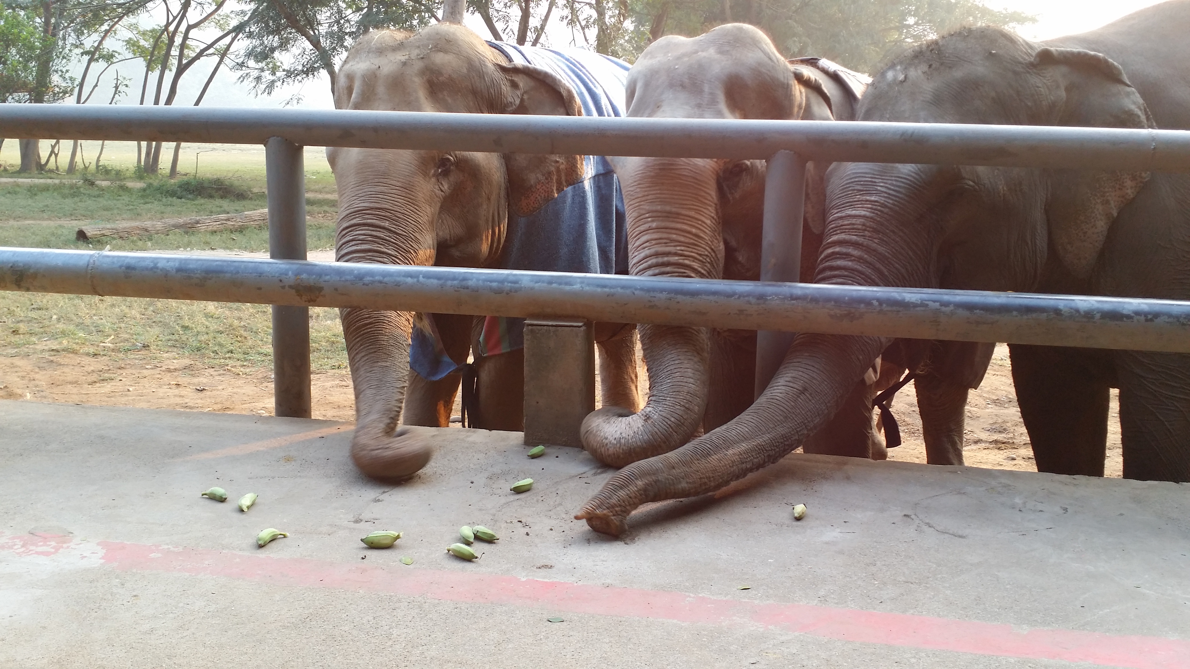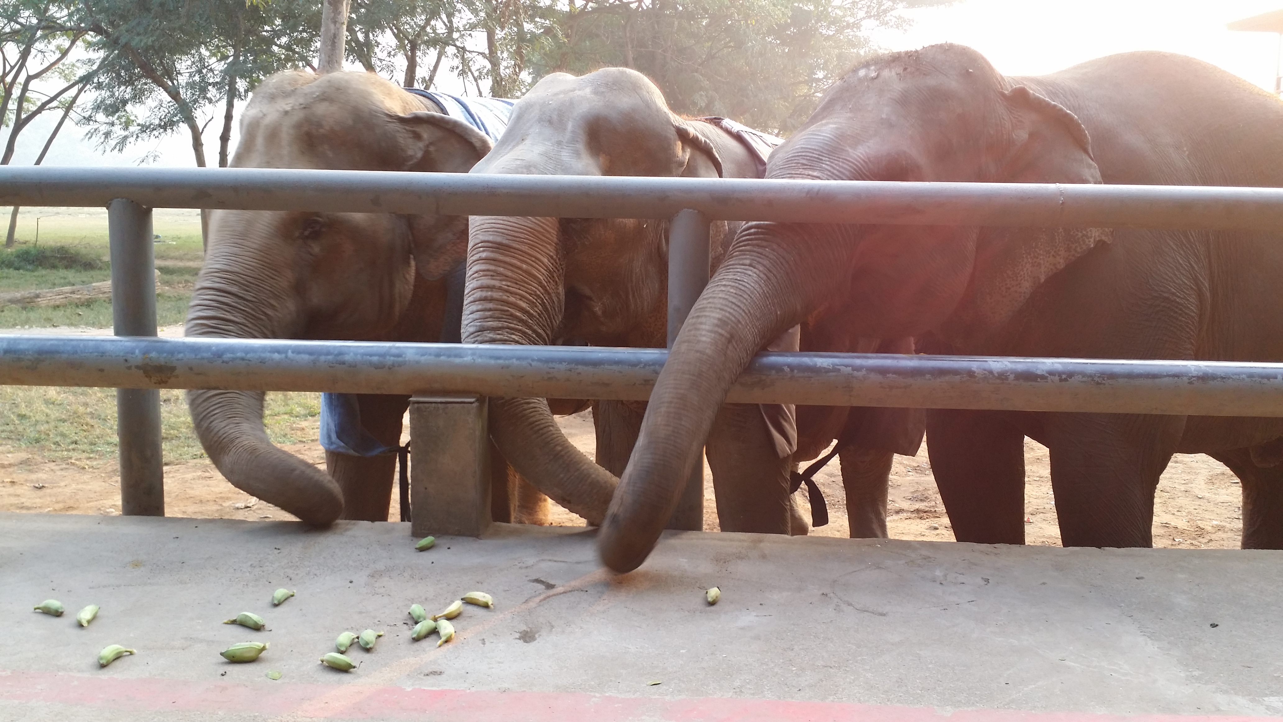 Since we are by ourselves until the next set of volunteers arive, we have for three hours in the elephant kitchen. We have no common language except hello, ‘swa dee ka’ and thank you, ‘khab kun ka’, but somehow we are all able to communicate just fine with gestures and smiles. 🙂 We spent most of the time peeling the rinds from the watermelon since the older elephants have difficulty chewing through the rinds. We also washed a lot of pumpkins.